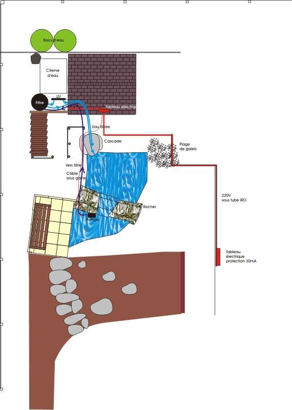 L'eau est pompée dans le bassin du bas. Elle est relevée jusqu'au filtre. (voir les détails du filtre) Elle est séparée en 2 retours vers le bassin du haut: le premier est filtré en ultra-violet (11 watts) et refoulé par la cascade, le deuxième injecté sous l'eau de la cascade Tout le réseau d'eau est du tuyau annelé qui fait environ 40 mm de diamètre (il n'est pas très facile à manipuler) La pompe est de la marque Intermas Celloplast, d'abord une Sirus 5400 puis maintenant une Sirus 6000 Explications : la Sirus 5400 s'est remplie d'eau au bout d'une trentaine de mois, cela était dû, après expertise, à un trop long stokage chez le détaillant (2 à 3 ans). La garantie sur cet article est de 2 ans! Hors garantie, le service commerciale m'a fait une offre défiant toute concurrence pour son remplacement ;-) encore, merci.