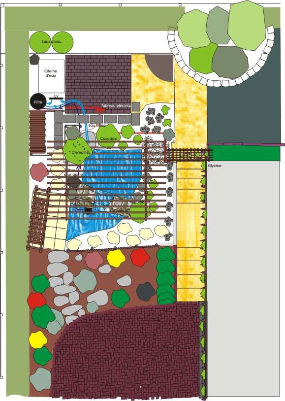 Un moyen d'ombrager le bassin en été: une pergolaSur laquelle pourraient courrir la glycine, la clématite, et le chévrefeuille