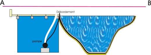 Sous le dallage, je dispose d'un volume de près d'un mètre cube Coupe du bassin du bas Débordement du bassin du bas dans une cuve enterrée, déplacement de la pompe dans celle-ci.Cela donnerait un niveau constant au bassin du bas