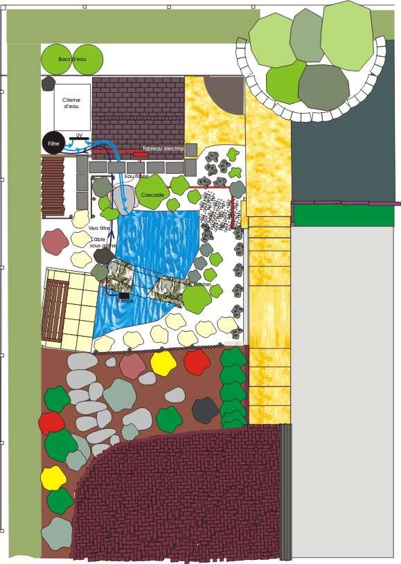 LE PROJET Voici le dessin général : contenance bassin du haut : 1,7m3, surface de 2m x 2.30m, profondeur maximum 90cm bassin du bas : 1m3, pour une surface de 1.70m x 1m, profondeur maximum 85cm dénivellation entre les 2 bassins : 40 cm hauteur de refoulement de la pompe : 1.50m, débit maximum 6000 litres/heure